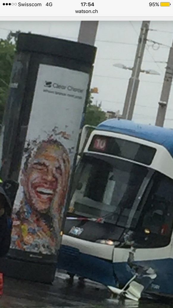 Erste Bilder vom User zeigen eine beschädigte Führerkabine, ein entgleistes Tram und eine aufgerissene Seite.
