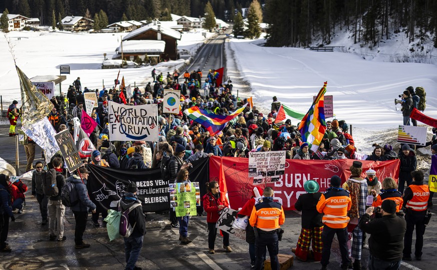 Die Polizei hat vor Davos GR am Sonntagnachmittag Hunderte Demonstrierende von der Strasse gedrängt. Sie nahmen an einer Protestwanderung gegen das Weltwirtschaftsforum (WEF) teil. Es entstanden lange Staus mit über einer Stunde Wartezeit.