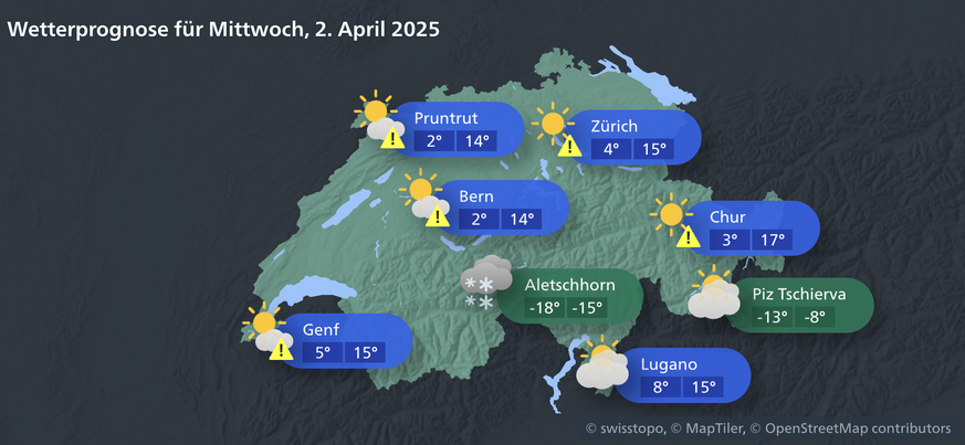 Morgen schwächt sich die Bise etwas ab. Im Mittelland weht sie nur noch mässig. Am Donnerstag lässt der Wind nach, trotzdem solltest du nicht gleich auf leichtere Kleidung umsteigen. Morgens sind es nur etwa 2 Grad, am Nachmittag steigen die Temperaturen auf 18 Grad.