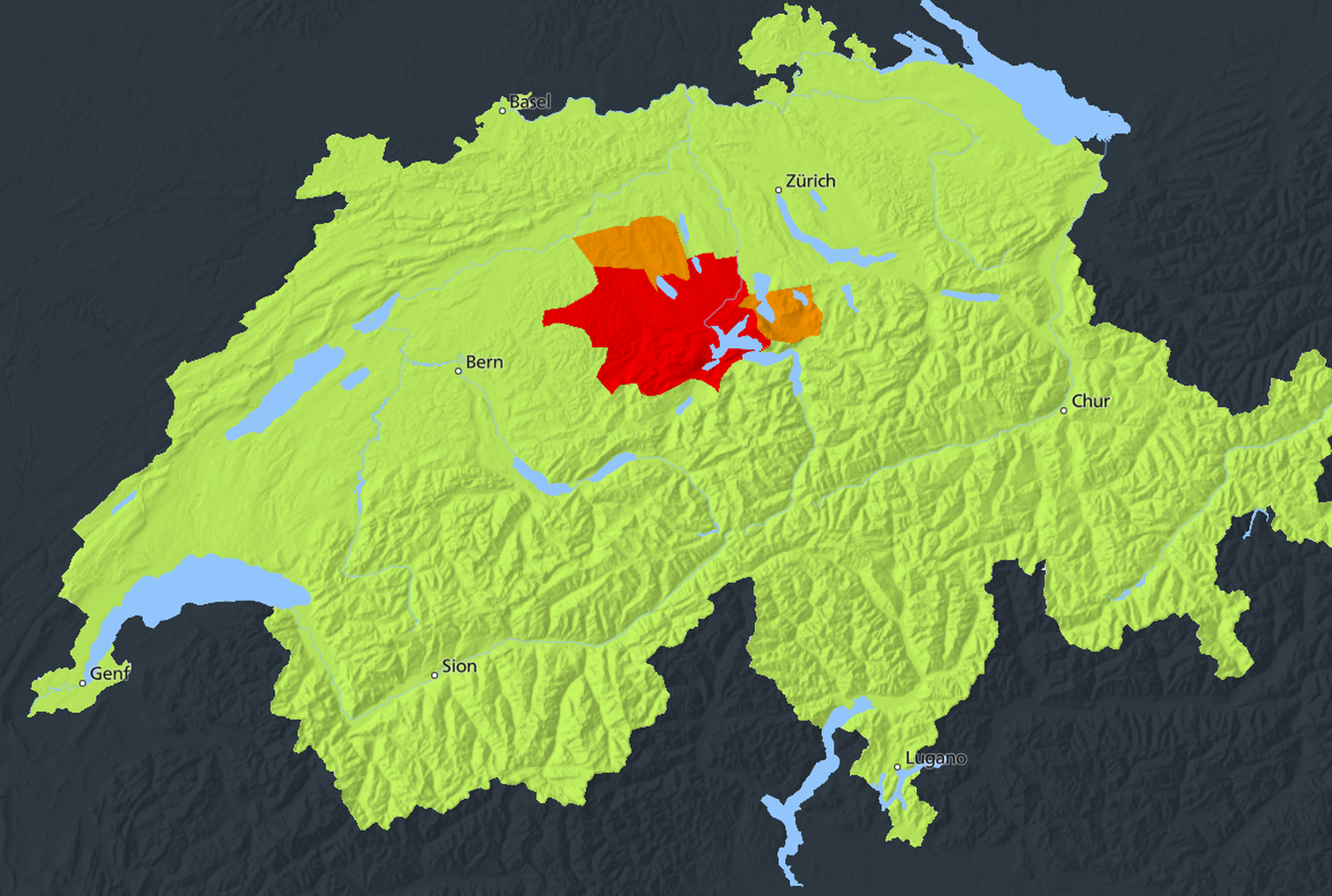 Am Abend hat der Bund für die Region Luzern die Gefahrenstufe 4 ausgerufen. Das Gebiet umfasste das Entlebuch, die Agglo Luzern bis nach Alpnach und nördlich Richtung Hochfdorf. Auch das Gebiet um den Sempachersee und die Region Huttwil-Willisau waren betroffen. Gefahrenstufe 4 bedeutet, dass Bäume umstürzen und grössere Äste abbrechen können. Exponierte Lagen sollten wegen der Gefahr eines Blitzeinschlags gemieden werden. Es sind auch Hagelschäden möglich.