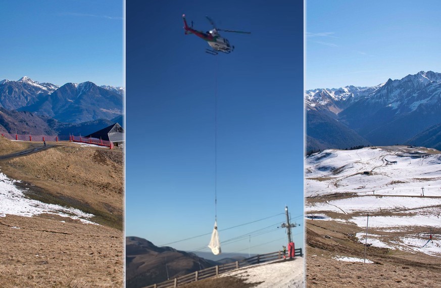 Es sind bizarre Bilder, die uns aus der Skistation Luchon-Superbagnères in den Pyrenäen erreichen. Ein Helikopter fliegt als Unterlast eine Ladung Schnee auf einen Berggipfel. Die Skifahrer schauen mit grossen Augen zu, wie die weisse Pracht angeflogen kommt. Im Hintergrund sind grasgrüne Bergketten zu sehen. Am vergangen Wochenende transportierten die Helis total 50 Tonnen Schnee in das vom Schneemangel geplagte Skigebiet.
