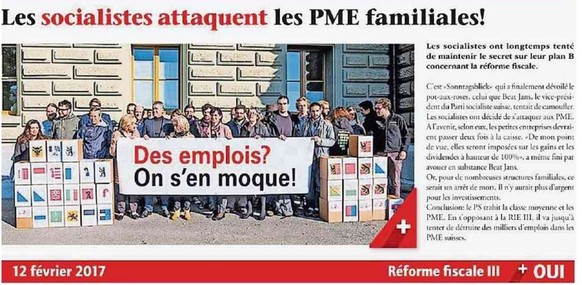 Der Gewerbeverband, der sich für die Vorlage einsetzt, hatte in der französischsprachigen Ausgabe seiner Gewerbezeitung auf einem Foto der Einreichung des USR III-Referendums ein Transparent mit einem eigenen Text überschrieben. Dieser wirft den Linken vor, Arbeitsplätze seien ihnen egal.