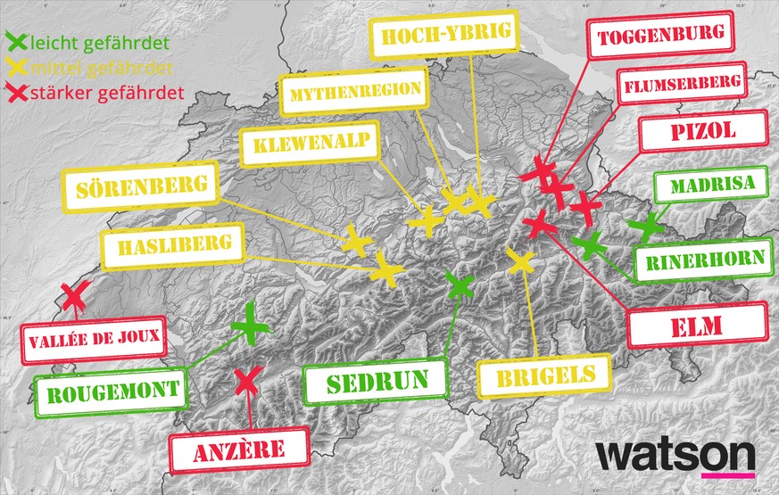 Die 16 Gebiete auf der Karte (siehe ganz oben) sind alle mittelgross (40 bis 80 Pistenkilometer) und liegen im Durchschnitt unter 2000 Meter. Wie stark gefährdet die Gebiete eingestuft wurden, hängt von der Schneesicherheit, dem Anschluss an grössere Skigebiete und den Besucherzahlen in den letzten vier Jahren ab. (leo)