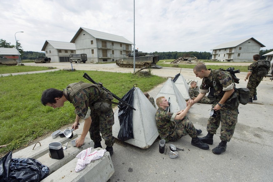 THEMENBILD ZU BUDGET ARMEE INFRASTRUKTUR BERATUNGEN AN DER SESSION NATIONALRAT - Rekruten der Panzergrenadiere Pz Gren Rekrutenschule in der Mittagspause auf dem Waffenplatz Bure, aufgenommen am 18. J ...