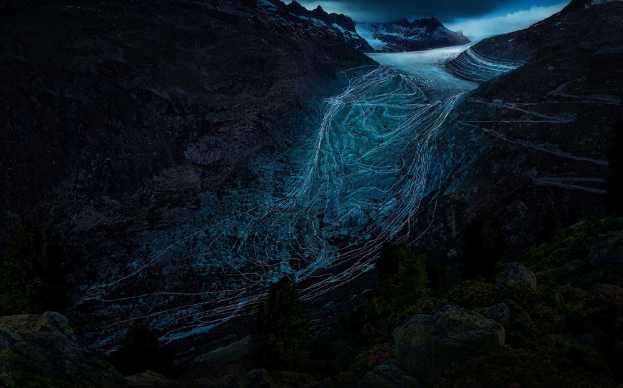 Anschliessend hat er mehrere Dutzend der so entstandenen Aufnahmen zu zwei interaktive Fotos vereint, die mit leuchtenden Linien den dramatischen Rückzug des Triftgletschers in Bern und des Rhonegletschers im Wallis aufzeigen.