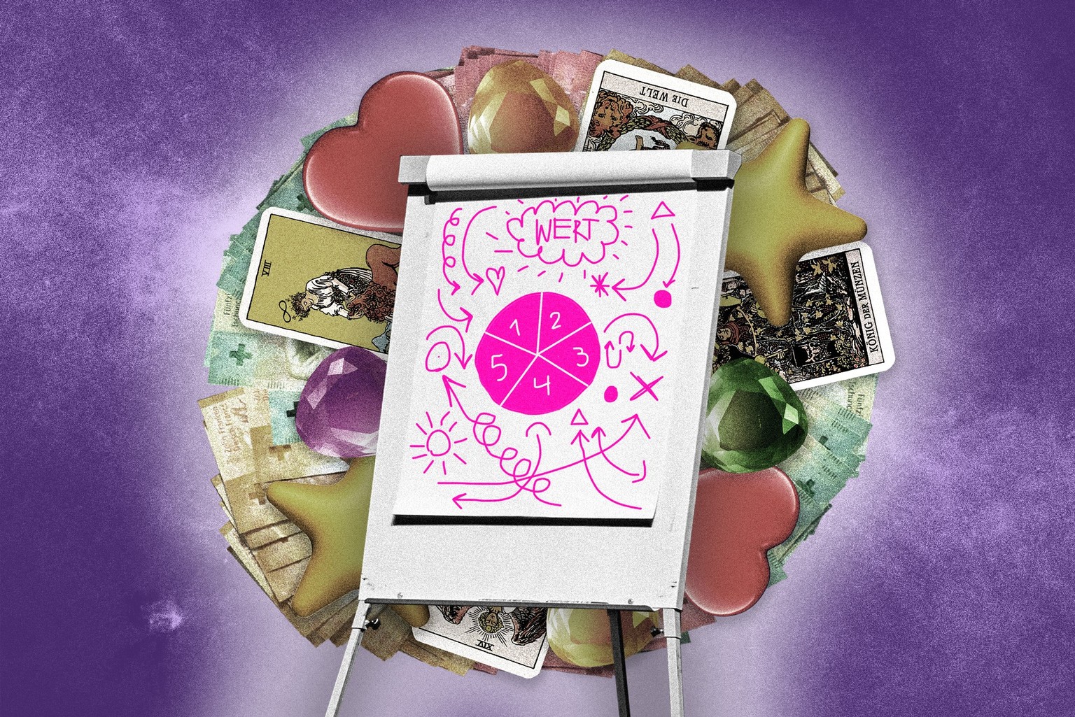 Als Nächstes zückt er rote und grüne Blätter. Dort sollen wir «Zielsätze», «Evidenzen», «Metaziele», «Probleme», «Meta-Probleme», «Problem-Evidenzen» aufschreiben. Das sind alles verschiedene Konzepte. Die wir wiederum auf einer Skala von -10 bis 10 bewerten sollen. Wobei, nein, manche müssen wir auf einer Skala von -4 bis 4 bewerten. Oder war es doch anders?