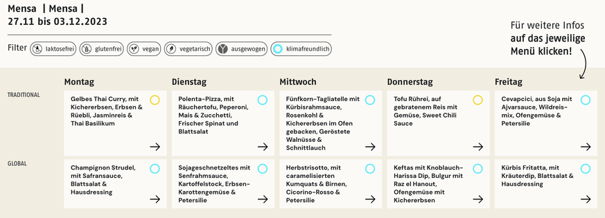 Auf den Tisch kommen Gerichte wie «vegane Cevapcici aus Soja mit Ajvarsauce, Wildreismix, Ofengemüse & Petersilie» oder «Fünfkorn-Tagliatelle mit Kürbisrahmsauce, Rosenkohl & Kichererbsen im Ofen gebacken, geröstete Walnüsse & Schnittlauch».