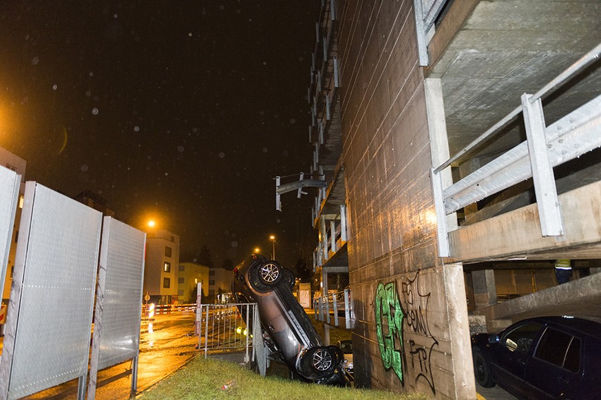 Das Auto rammte dem Polizeimitarbeiter zufolge aus unbekannten Gründen kurz vor 18.30 Uhr die Leitplanke auf der zweiten Etage und fiel aus dem Parkhaus an der Binzmühlestrasse. Ein Passant alarmierte die Rettungskräfte.