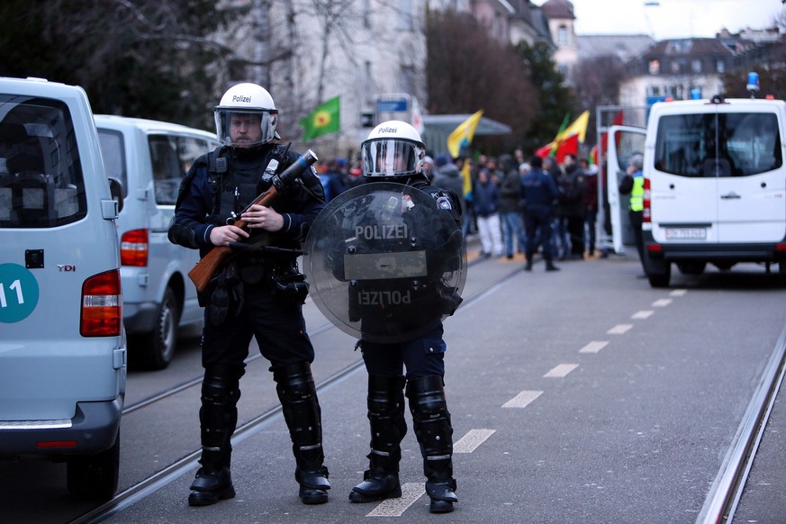 Gemäss Angaben der Stadtpolizei besammelten sich kurz vor 16.30 Uhr vor dem türkischen Generalkonsulat an der Weinbergstrasse rund 100 Personen zu einer unbewilligten Demonstration. Dabei seien Fahnen, Steine und andere Wurfgegenstände gegen das Konsulat geworfen worden.