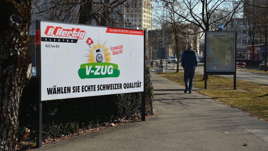 «Das hat uns sehr erstaunt», so die Reaktion von V-Zug-Marketingchef Christian Bärlocher zum Plakat eines Elektrogeschäfts in Tann (ZH). Auf dem Plakat, das unter anderem in Uster hängt, denkt man im ersten Moment, das SVP-Parteilogo zu erkennen, nur statt der Sonne ist eine Waschmaschine zu sehen und statt den drei Buchstaben, steht auf dem grünen Hintergrund der Name des Zuger Traditionskonzerns V-Zug. Darunter der Schriftzug: «Wählen Sie echte Schweizer Qualität».