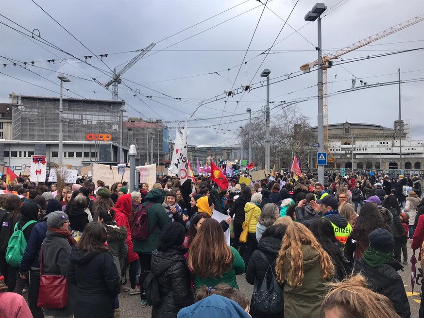 Die Stadtpolizei informierte laufend via Twitter: «Im Zusammenhang mit dem Weltfrauentag versammeln sich momentan Personen im Kreis 1. Ein Dialogteam der Polizei ist vor Ort. Bleibt bitte friedlich und sucht den konstruktiven Dialog, damit der Anlass für beide Seiten möglichst problemlos verläuft.»