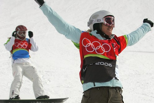 17.02. 2006: Tanja Frieden freut sich schon über den silbernen «Plämpu», als Lindsey Jacobellis ihr Gold schenkt