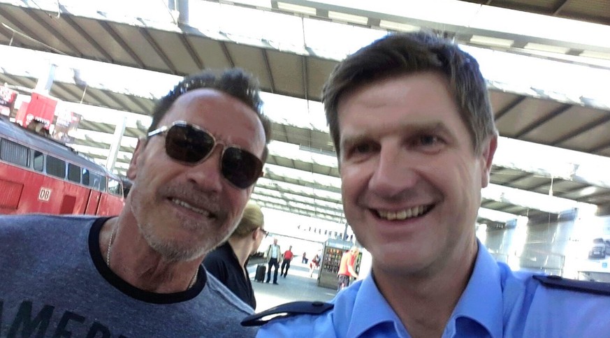 Höflich erkundigte er sich, ob alles in Ordnung sei. Die Belehrung durch den Polizisten akzeptierte er. «‹Arnie› sah es ein und meinte süffisant, dass er momentan schlecht zu Fuss sei», berichtete die Bundespolizei. Als kleine Entschädigung für das Fehlverhalten gab es ein Selfie mit dem Polizisten. Danach verliess der «Terminator» den Hauptbahnhof durch den Nordausgang. (aargauerzeitung.ch)