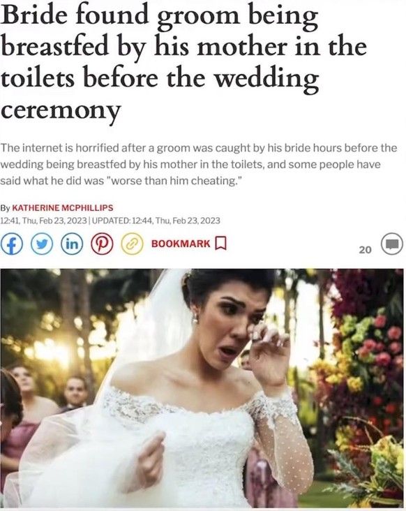 Braut findet Bräutigam vor, wie der von seiner Mutter vor der Trauung auf der Toilette gestillt wird.