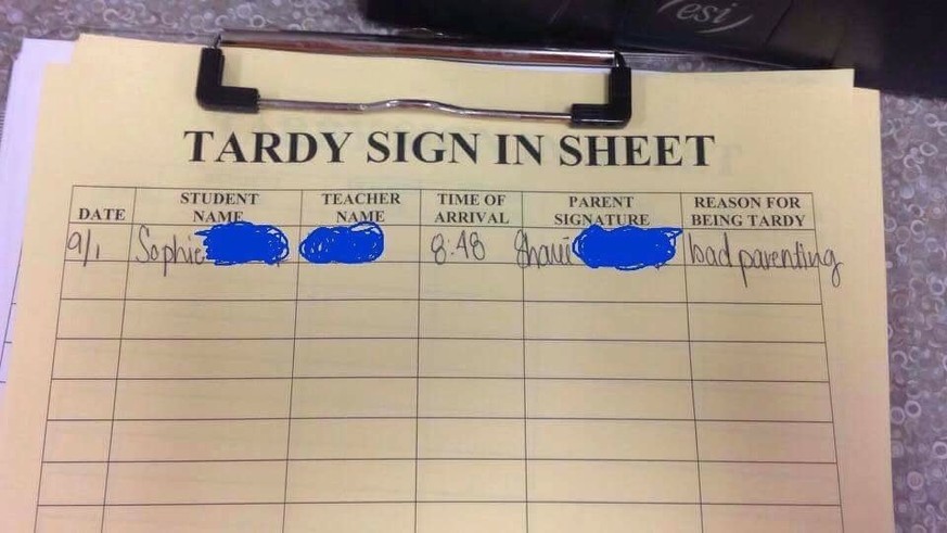 Nichts da! Ehrlichkeit währt am längsten! Das dachte sich zumindest eine Mutter, die gerade auf der Social-Media-Plattform Reddit ordentlich gefeiert wird. Weil sie ihre Tochter zu spät zur Schule gebracht hatte, musste sie ein entsprechendes Formular ausfüllen und den Grund für dieses Fehlverhalten nennen.