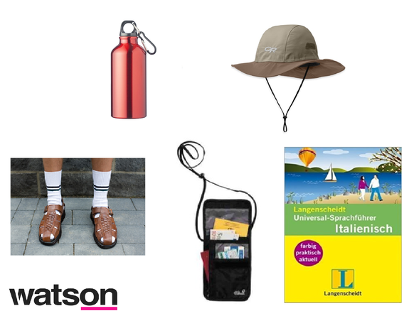 Heimeliges Schuhwerk gestaltet die Gruppenausflüge durch die Altstadt angenehm, während die Socken vor Unterkühlung an Schattenplätzen schützen. Die Flasche beugt Dehydrierung vor, die bei Stadtrundgängen eine hohe Gefahr darstellt. Im Brustbeutel können alle Dokumente verstaut werden. Alle. Dank dem Reisewortschatz hingegen kann man gut und gerne einen Kaffee akzentfrei in der Landessprache bestellen, wobei Ein solcher Hut das internationale Zeichen für «Tourist» ist und so vor unbehaglichen Momenten mit Einheimischen schützt.