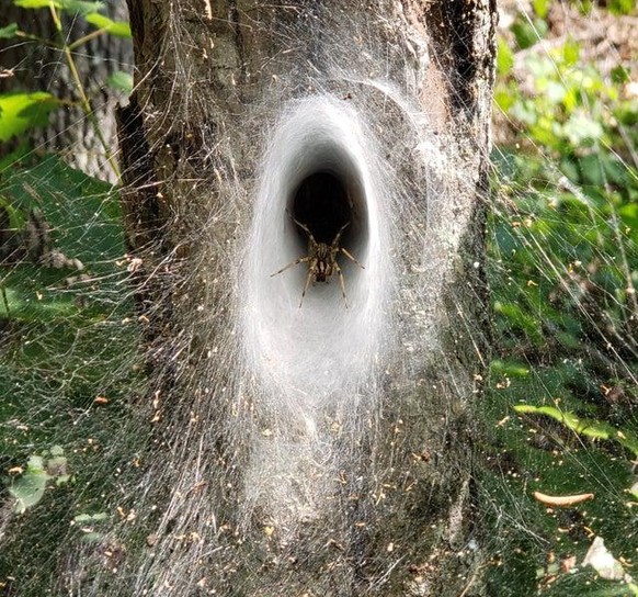 Vermutlich handelt es sich hier um eine Gattung aus der Familie der Wolfsspinnen. Sie betreiben keine Netzjagd, sondern lauern ihrer Beute auf und vergiften diese. Das «Netz» hier ist lediglich ihr Nest.