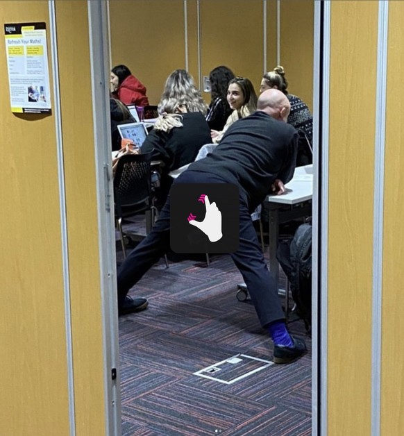 Das rote Rechteck am Boden verlangt wohl nach dieser Pose.