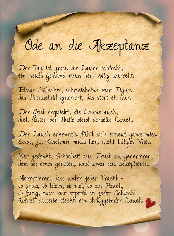 Oder kurz: Kleider machen meinetwegen Leute. Aber nicht unbedingt bessere. Spar's dir. (Also vielleicht nicht direkt alle Kleider)