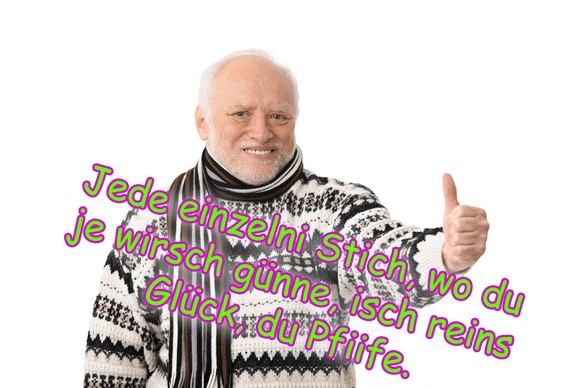 Apropos hinweisen: Dass es sich um einen wirklichen Jass handelt, erkennst du daran, dass dir immer genau eine Karte für einen phänomenalen Weis fehlt, während deine Gegner die unmöglichsten, aberwitzigsten und vor allem lächerlichsten Weise in der Geschichte des Sports auf der Hand haben.