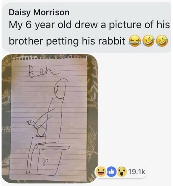 Als ob wir nicht alle schon mal ein Kaninchen gestreichelt hätten. Mein 6-Jähriger hat ein Bild von seinem Bruder gemalt, der sein Kaninchen streichelt.