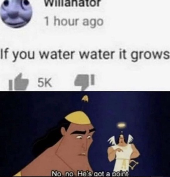 Darüber habe ich noch nie nachgedacht. Wenn du Wasser giesst, wächst es. Nein, nein. Er hat nicht ganz Unrecht.