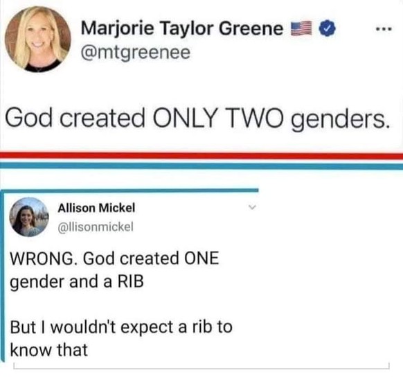 «Falsch. Gott schuf ein Geschlecht und eine Rippe. Aber ich würde nicht erwarten, dass eine Rippe das weiss.»