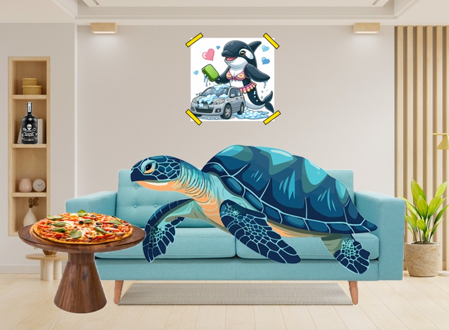 Eine blaue Schildkröte sitzt auf dem Sofa und isst Pizza