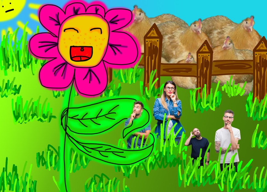 Welche Motive wünschst du dir? Blume, die Menschen pflückt neben Feld mit mehreren dicke Hühnern
