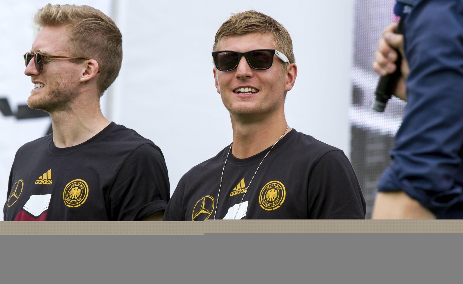 Andre Schürrle und Toni Kroos beim Empfang der Deutschen Nationalmannschaft auf der WM-Fanmeile auf der Straße des 17. Juni vor dem Brandenburger Tor. Berlin, 15.07.2014 xM.xGole ...