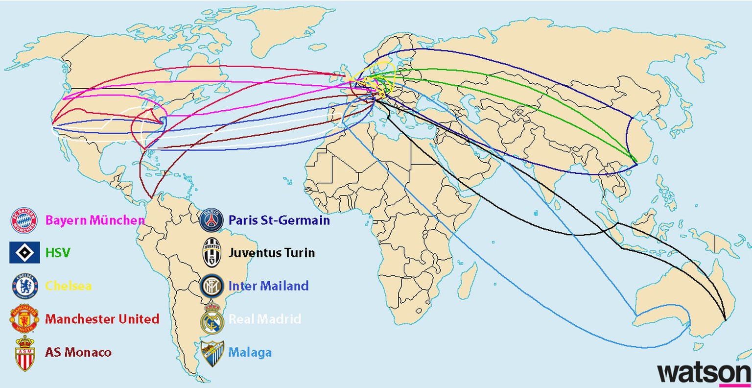 Die Vorbereitungs-Reiserouten von zehn Klubs aus den besten fünf Ligen. Mobile-User klicken hier!Bild: watson