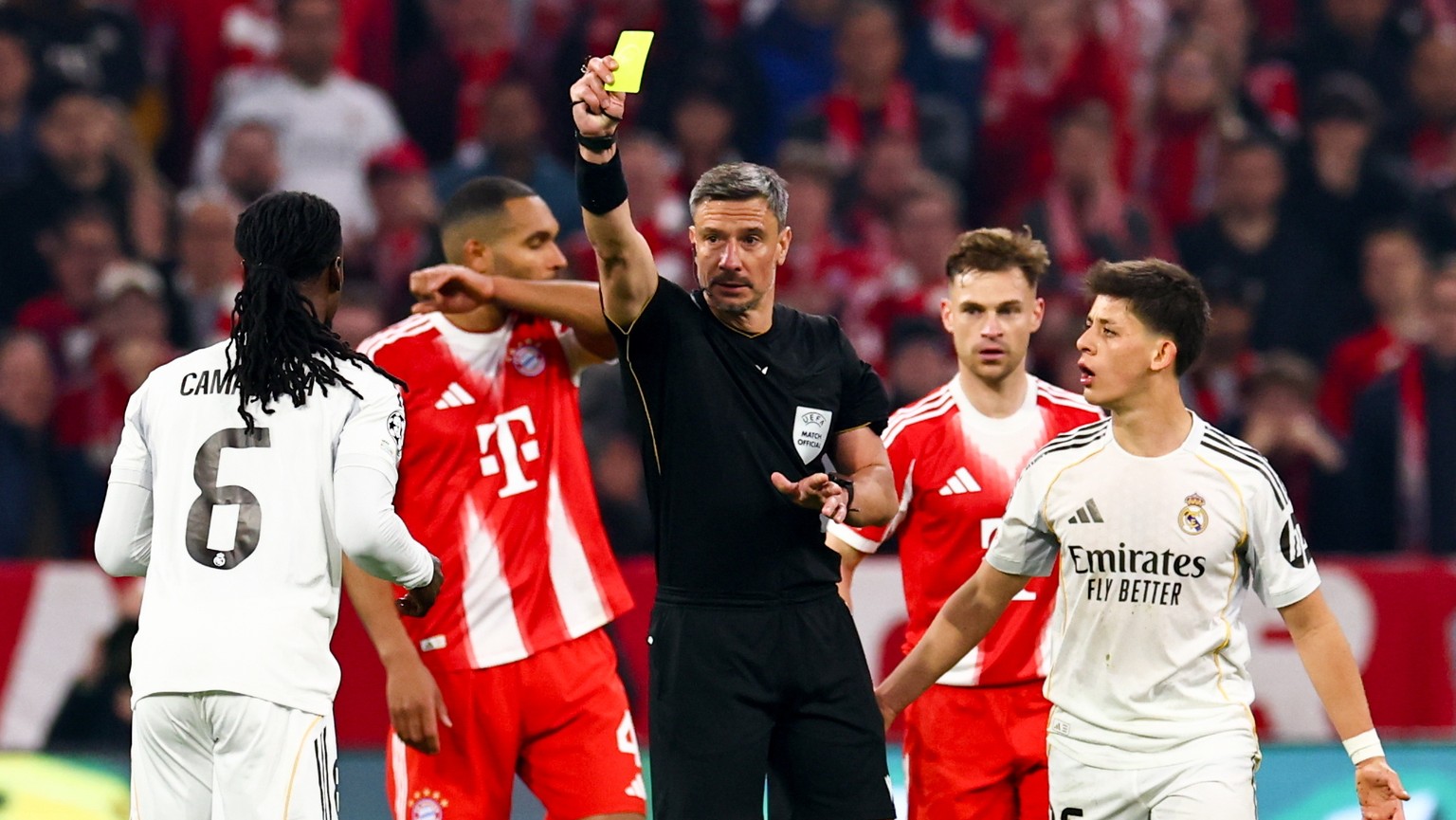 Es läuft die 86. Minute in der Münchner Allianz Arena, Real Madrid führt 3:2, die Verlängerung naht, als Eduardo Camavinga Gegenspieler Harry Kane foult und dann den Ball aufliest und etwas wegwirft. Schiedsrichter Slavko Vincic zeigt ihm die Gelbe Karte, dreht sich weg und zückt dann erst die Rote Karte, mit der er den französischen Mittelfeldspieler vom Platz schickt. Nicht nur Camavinga reagiert mit Unverständnis, auch weitere Real-Stars wie Kylian Mbappé oder Arda Güler können es nicht fassen.