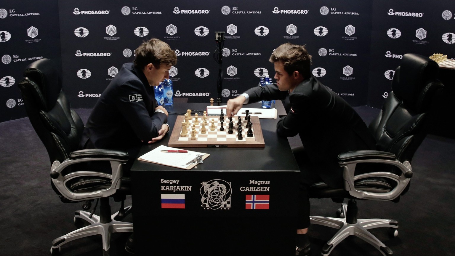 Dass die beiden WM-Finalisten genügend Schach-Neuronen in ihrem Schädel untergebracht haben, ist unschwer zu erkennen. Ganz deutlich wird das bei Carlsen, dem grossen Star der Szene mit den 32 Figuren. Er gibt sich immer wieder für Experimente wie das folgende hin: