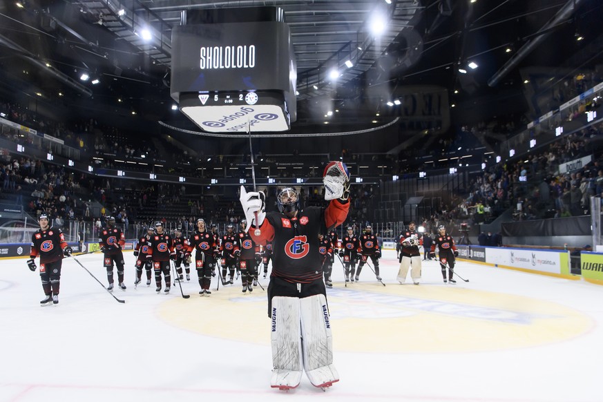 Fribourg's goaltender Connor Hughes celebrates the victory (5-2) with teammates during the Champions Hockey League game day 2 between Switzerland's HC Fribourg-Gotteron and Slovakia's H ...