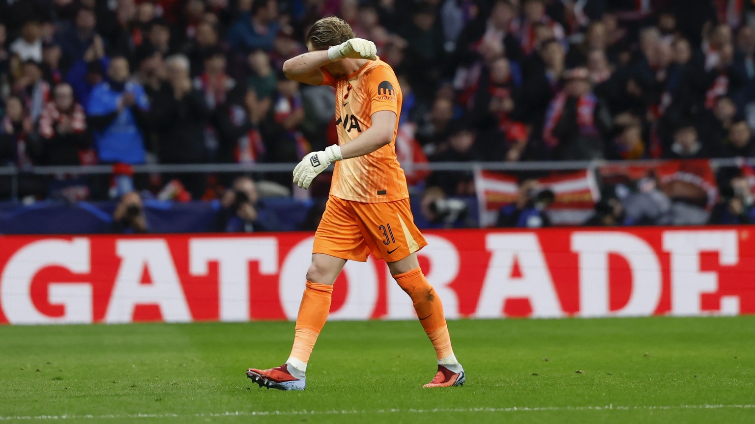 epa12810068 Tottenham goalkeeper Antonin Kinsky reacts as he leaves the pitch for a substitution during the UEFA Champions League round-of-16 first leg soccer match between Atletico Madrid and Tottenh ...