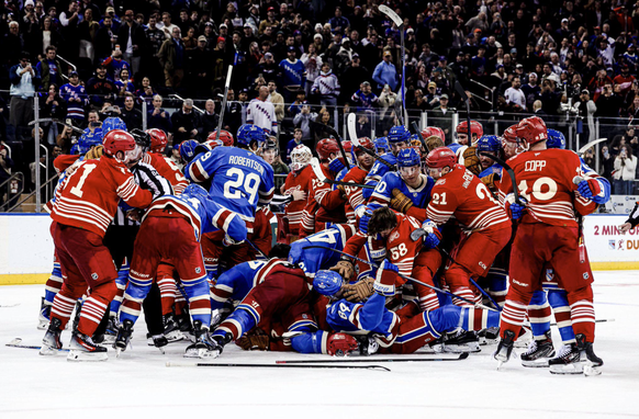 Der Grund für die Massenschlägerei ist kurios: Detroit führte mit 2:1 und Red-Wings-Stürmer Mason Appleton schoss den Puck ins leere Rangers-Tor. Doch die Zeit war da schon für einen Sekundenbruchteil abgelaufen und die Sirene ertönte. Rangers-Goalie Jonathan Quick empfand diesen verspäteten Schuss offenbar als Respektlosigkeit und knöpfte sich Appelton vor, was dann die Rangelei auslöste.