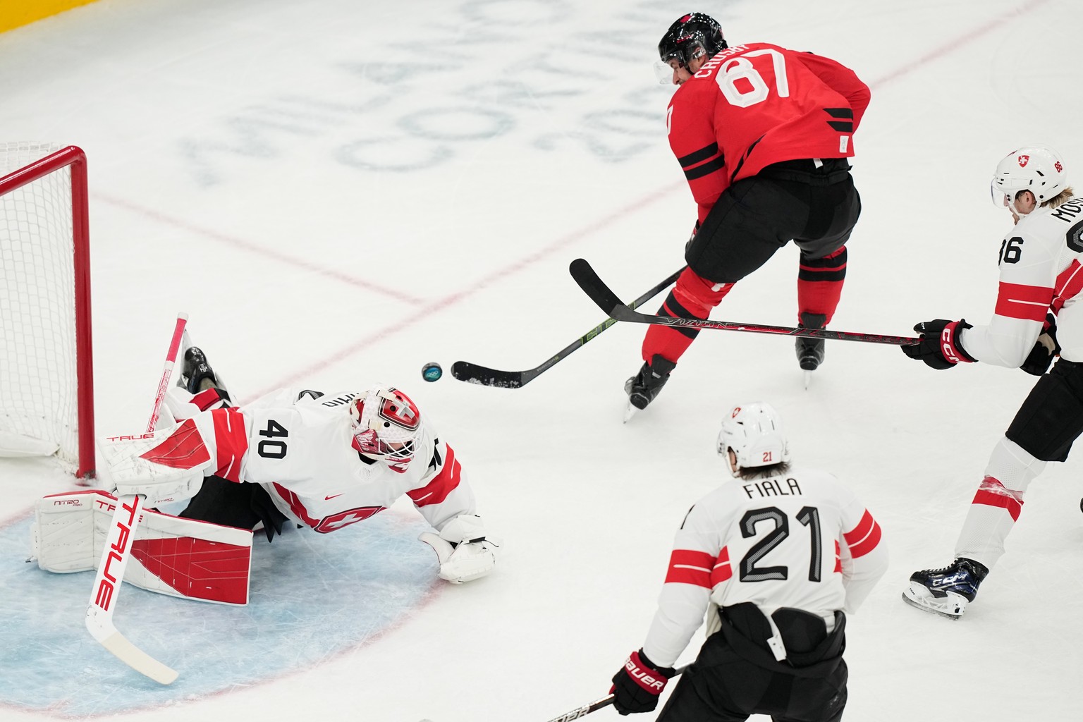 Schmid wird im ersten Drittel zwar zwei Mal bezwungen, sieht beim ersten nicht vorteilhaft aus, zeigt aber ansosnsten durchaus seine Klasse. Besonders sehenswert ist dabei eine Parade aus der siebten Minute. Nach einem Puckverlust von Kevin Fiala an der offensiven blauen Linie zieht plötzlich der kanadische Captain Sidney Crosby alleine auf den Schweizer Goalie los. Crosby zeigt extrem viel Geduld, zieht Schmid auf die Seite raus, aber der Schweizer Goalie bringt im letzten Moment noch die Schlittschuhkufe dazwischen – eine absolute Glanzparade.