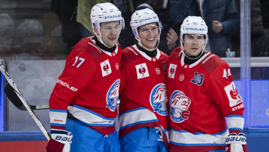 Santtu Kinnunen (ZSC), center, celebrates the 3:1 goal during the Champions Hockey League semi final game between Switzerland's ZSC Zurich and Switzerland