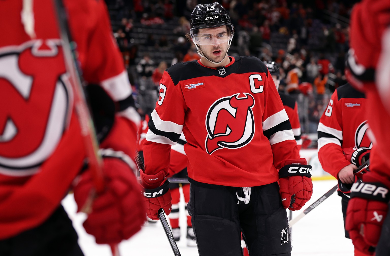 New Jersey Devils center Nico Hischier (13) skates off the ice after the Devils lost to the Philadelphia Flyers in an NHL hockey game Tuesday, April 7, 2026, in Newark, N.J. (AP Photo/Adam Hunger)