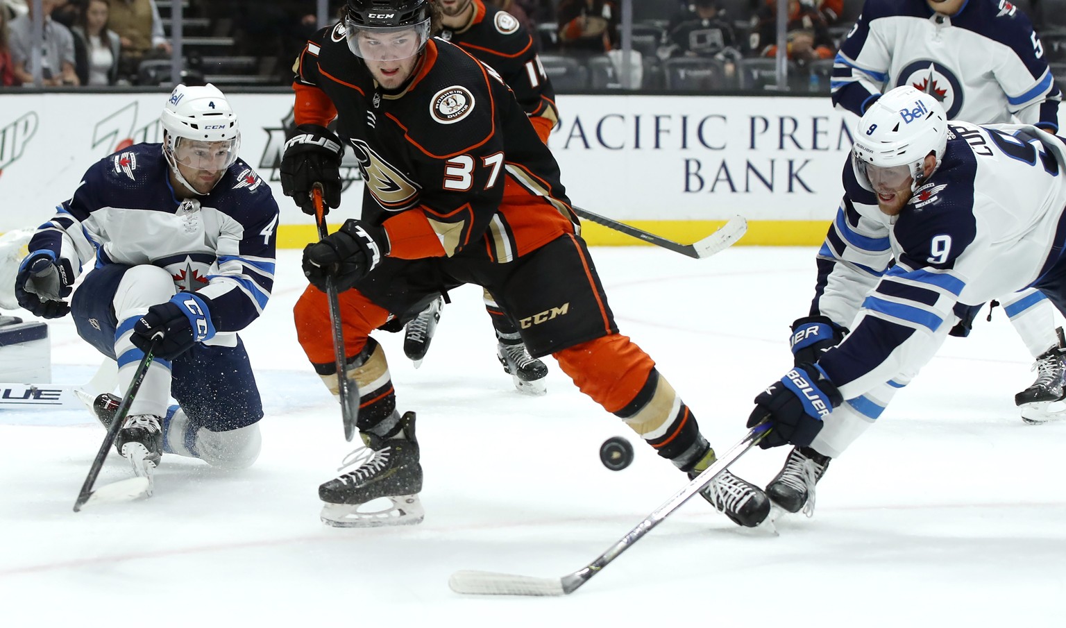 Als ob der Tag für Mason McTavish nicht schon traumhaft genug verlief, wurde er sogar noch viel besser. Denn wie konnte es anders sein: Natürlich erzielte der kräftige Flügelstürmer, der im Sommer von den Ducks im NHL-Draft an dritter Stelle gewählt worden war, in seinem ersten NHL-Spiel auch gleich sein erstes NHL-Tor. Nach einem Gewühl vor dem Tor der Winnipeg Jets stand er goldrichtig und verwertete einen Abpraller zum 2:0.
