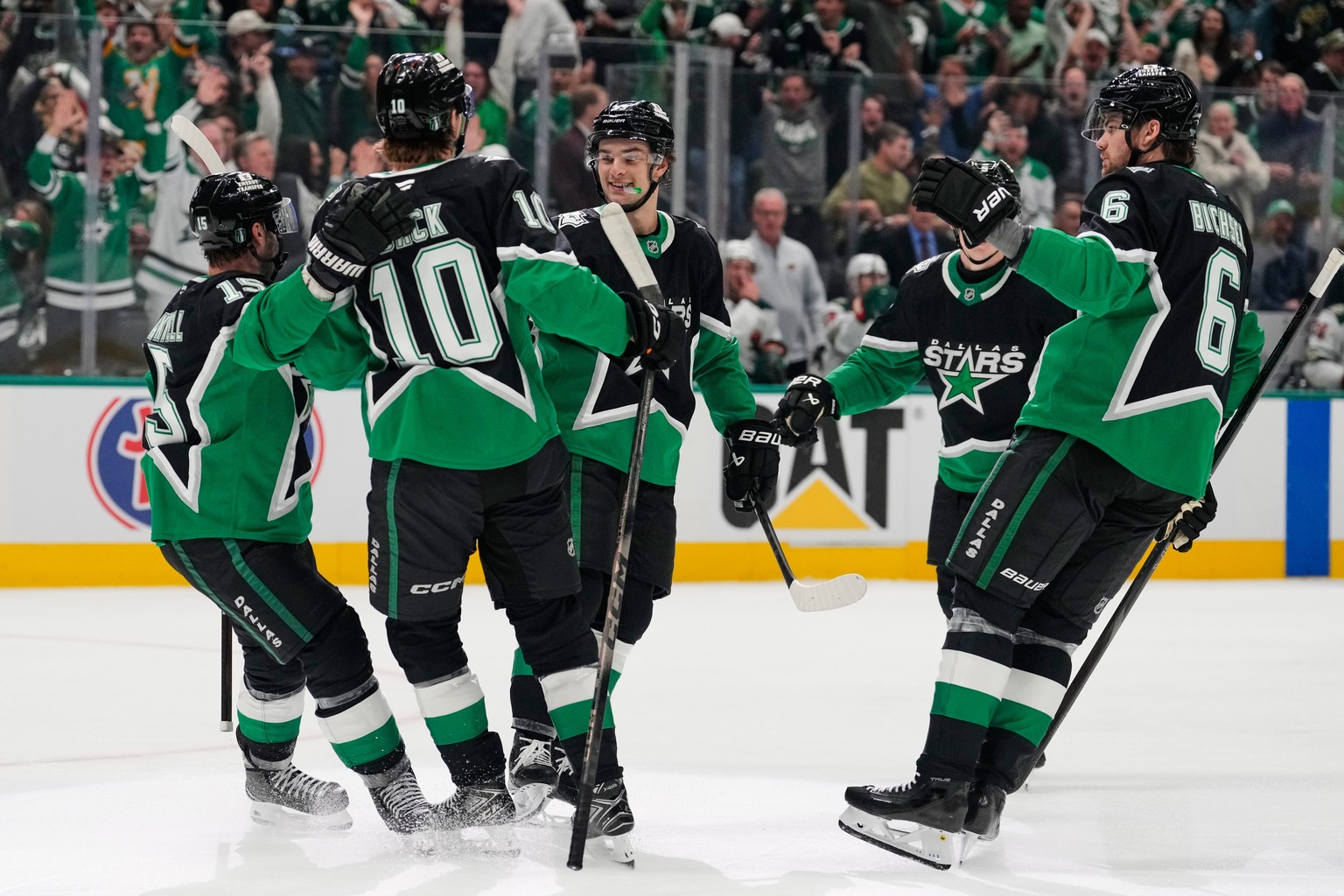 Dallas Stars' Colin Blackwell (15), Oskar Bäck (10), Wyatt Johnston, center rear, and Lian Bichsel (6) celebrate after Johnston scored against the Minnesota Wild in the first period of Game 2 of  ...