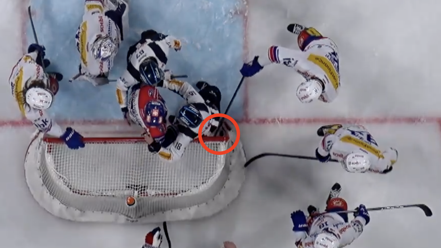 Nachträgliche Ergänzung: Nach dem Anpfiff zeigt Schiedsrichter Stefan Hürlimann zuerst an, dass das Tor im Videostudium angeschaut werden soll. Danach macht er einen zaghaften «Wash-Out» – also das Zeichen für kein Tor (siehe Screenshot unten). Zu diesem Zeitpunkt geht er allerdings noch von einer Torhüterbehinderung (Torraum-Offside) aus. Nach der Besprechung mit seinen Kollegen wurde er dann vermutlich aufgeklärt, weshalb auf dem Eis dann doch auf Tor entschieden wurde.