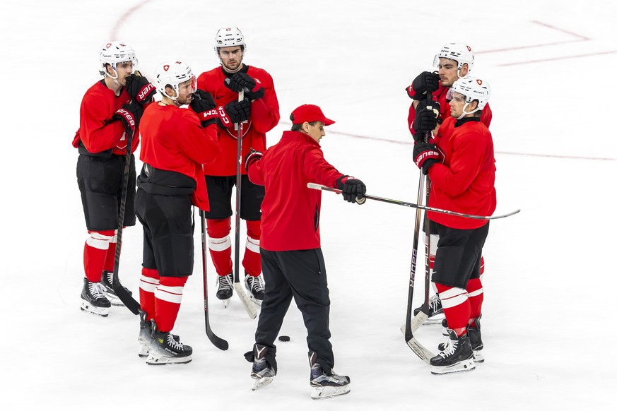 Patrick Fischer, 3rd right, head coach of Switzerland national ice hockey team, speaks to Switzerland's Denis Malgin, left, Switzerland's Roman Josi, 2nd left, Switzerland's Nico Hischi ...