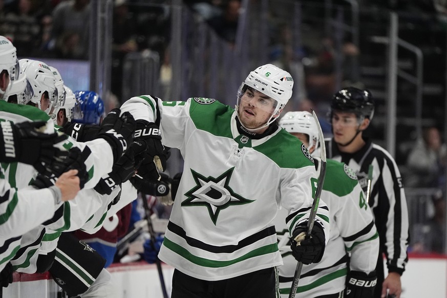 Dallas Stars defenseman Lian Bichsel is congratulated as he passes the team box after he scored the winning goal as time ran out in an NHL preseason hockey game against the Colorado Avalanche, Monday, ...