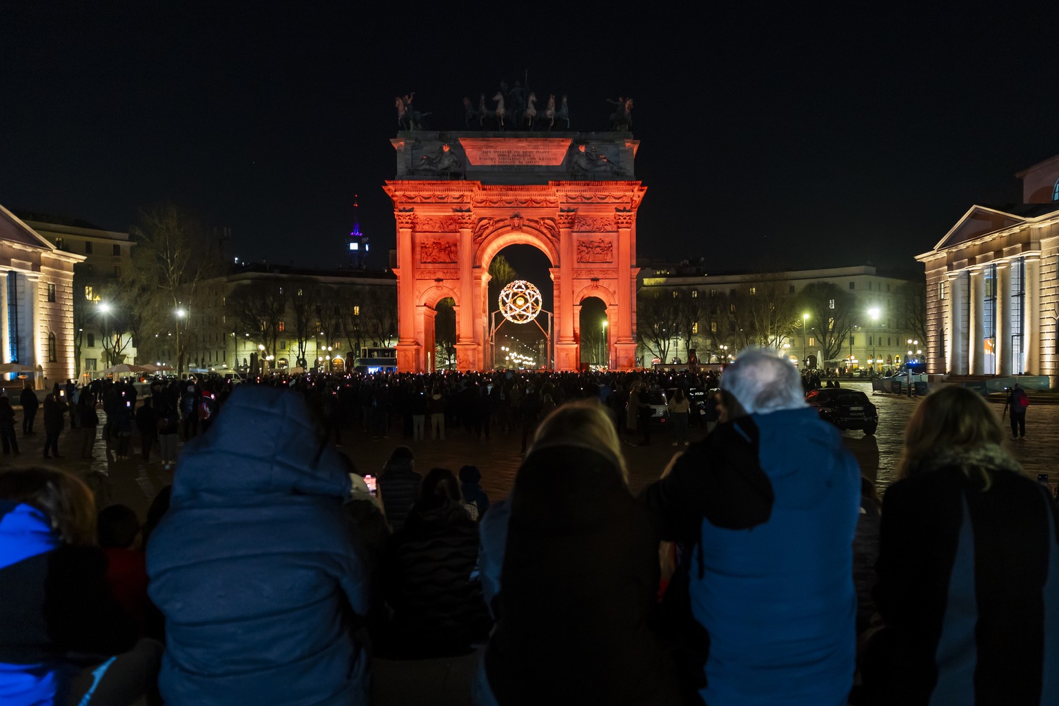 People watch the light show on the Arco della Pace and on the Olympic cauldron, where the Olympic flame burns during the 2026 Olympic Winter Games in Milan, Italy, on Saturday, February 21, 2026. (KEY ...