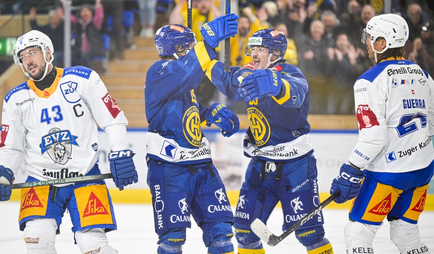 Simon Ryfors (HCD), Mitte, bejubelt sein 4-0 mit Yannick Frehner, neben Jan Kovar (EVZ), links, und Samuel Guerra (EVZ), rechts, im dritten Eishockey Playoff Viertelfinalspiel im Eishockey Spiel der N ...