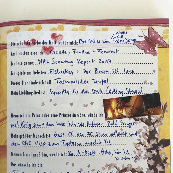 Trotz Instagram, Facebook und Snapchat ist das gute, alte Freundschaftsbuch nicht tot zu kriegen. Nico Hischier hat ebenfalls eines und das nimmt er jetzt in der NHL von Spiel zu Spiel mit. Schon viele Superstars und Schweizer Hockey-Kollegen haben sich eingetragen. Für uns öffnet Hischier sein Buch exklusiv!