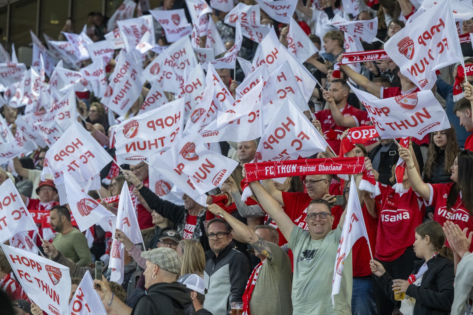 KEYPIX - Die Fans von Thun feiern vor dem Spiel beim Super League Meisterschaftsspiel zwischen dem FC Thun und dem FC Luganovom Samstag, 25. Maerz 2026 in Thun. (KEYSTONE/Urs Flueeler)