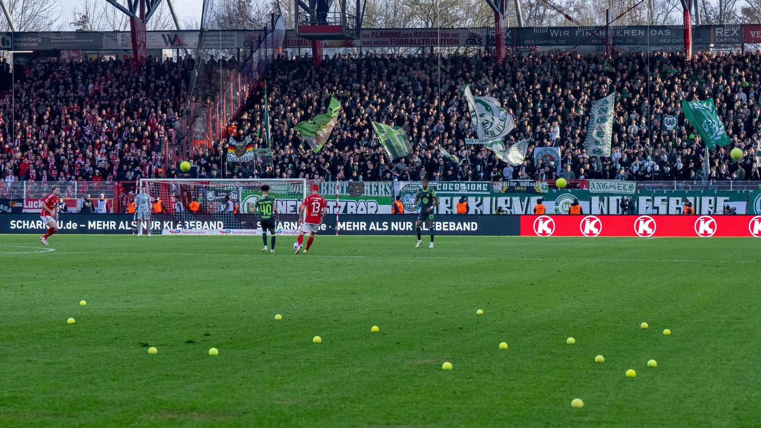 Geprägt war der Samstagnachmittag wie erwartet von den Protesten der Fans. Diese stören sich am Entscheid der Liga, eine prozentuale Beteiligung an den TV-Rechten für eine Milliarde an Investoren abzugeben. Speziell in Mönchengladbach (0:0 gegen Darmstadt) und bei Union Berlin (1:0 gegen Wolfsburg) mussten die Partien mehrmals unterbrochen werden.