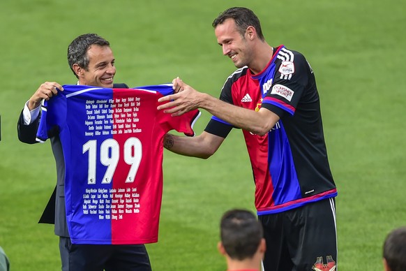 Spannender als das Spiel, war das Geschehen vor dem Spiel. Marco Streller erhält «sein» T-Shirt von Heusler.